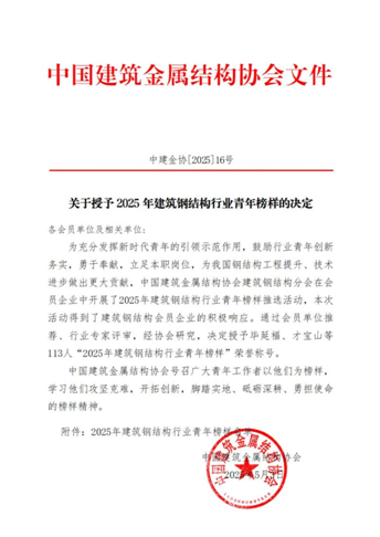 5月3日,中國建筑金屬結構協會公布《關于授予2025年建筑鋼結構行業青年榜樣的決定》,旨在充分發揮新時代青年的引領示范作用,鼓勵行業青年創新務實,勇于奉獻,立足本職崗位,為我國鋼結構工程提升、技術進步做出更大貢獻,通過單位推薦、行業專家評審,中建科工集團江西經理部總經理江亞鵬同志憑借卓越的工程管理與科技創新能力斬獲佳績,獲評“2025年建筑鋼結構行業青年榜樣”榮譽稱號。