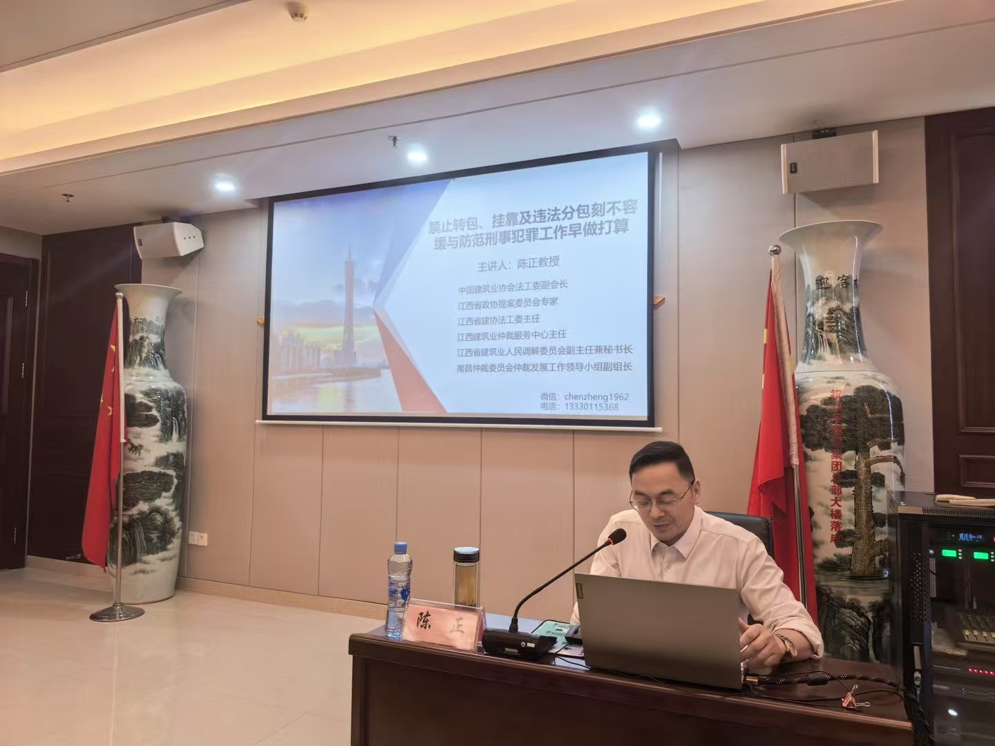 隨后,中國建筑業協會法工委副會長、江西省建筑業協會法工委主任陳正教授聚焦當前建筑行業痛點作《禁止轉包、掛靠及違法分包刻不容緩與防范刑事犯罪早做打算》專題講座。陳正教授深入剖析了轉包、掛靠及違法分包的巨大法律風險和現實危害,結合最新政策法規和典型案例,為建筑企業做了深刻警示;著重闡述了企業及相關負責人可能觸犯的刑事罪名及其嚴重后果,并提出系列預防手段,善內控機制,切實防范刑事風險。