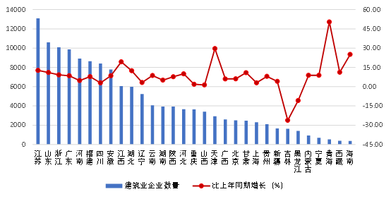 圖 3 2023 年上半年各地區(qū)建筑業(yè)企業(yè)數(shù)量及其增長情況