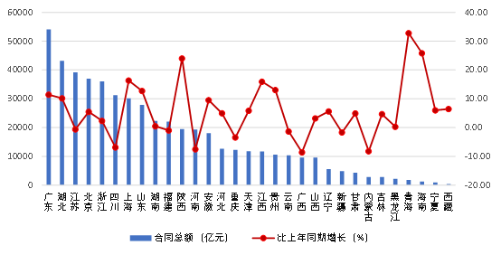 2023 年上半年,廣東、湖北、江蘇、北京、浙江、四川、上海等7個地區(qū)建筑業(yè)企業(yè)合同總額均超過30000億元,分別達到54142.75億元、43200.05億元、39176.44億元、37001.58億元、36004.49億元、31243.04億元和30146.28億元。合同總額超過 20000 億元的還有山東、湖南、福建3個地區(qū)。合同總額同比增長最快的是青海,達到了32.80%。海南、陜西、上海和江西的增幅也都超過了15%。9個地區(qū)合同總額出現(xiàn)負增長,其中廣西、內(nèi)蒙古的負增長均超過8%(圖6)。