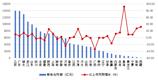 圖 7 2023 年上半年各地區(qū)建筑業(yè)企業(yè)新簽合同額及其增長情況