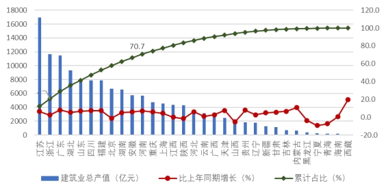 2024 年上半年,江蘇、浙江、廣東完成的建筑業總產值均超過 1 萬億元,分別達到 16947.56億元、11639.06億元和11439.1億元,分別占全國建筑業總產值的 12.3%、8.4%和8.2%。除江蘇、浙江、廣東外,總產值超過5000億元的還有湖北、山東、四川、福建、北京、湖南、安徽和河南共 11 個地區,上述 11 省市完成的建筑業總產值占全國建筑業總產值的 70.7%。從各地區建筑業總產值增長情況看,25個地區的建筑業總產值較上年同期都有不同幅度的增長。其中,西藏的增幅最大,達到了 19.7%,內蒙古次之,增幅達到了10.9%。寧夏、青海、山西、黑龍江、陜西和北京6個地區的建筑業總產值較上年同期出現負增長。(圖 1)