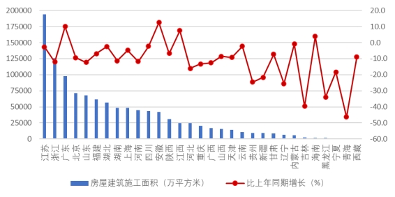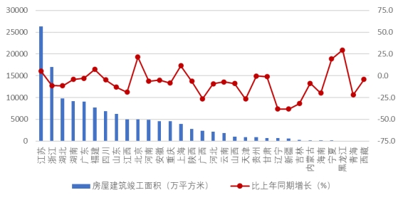 2024 年上半年,江蘇、浙江建筑業企業房屋建筑竣工面積均超過1億平方米,分別為2.63億平方米、1.70億平方米。房屋建筑竣工面積超過 5000萬平方米的還有湖北、湖南、廣東、福建、四川、山東、江西等 7個地區。黑龍江、北京的房屋建筑竣工面積增幅均超過了20%,分別為29.5%和21.3%。寧夏、上海的增幅也都超過了10%。25個地區房屋建筑竣工面積出現負增長,其中新疆、遼寧、吉林的負增長均超過30%(圖9)。