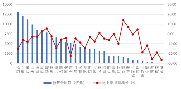 2025年上半年,江蘇、湖北、廣東3省建筑業企業新簽合同額均超過10000億元,分別達到13113.96億元、12058.65億元、11181.03億元。新簽合同額超過5000億元的還有浙江、山東、四川、福建、湖南、北京、安徽、河南、上海等9個地區。7個地區新簽合同額出現增長,同比增長最快的是新疆,達到了13.92%。24個地區新簽合同額出現負增長,其中西藏、青海、上海的負增長均超過20%(圖7)。