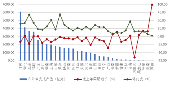 圖 2 2025 年上半年各地區在外省完成的建筑業總產值及外向度