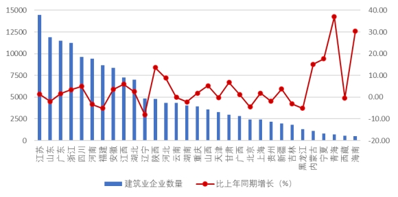 圖3 2025 年上半年各地區建筑業企業數量及其增長情況