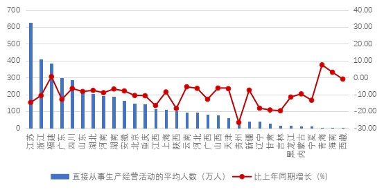 圖4 2025 年上半年各地區直接從事生產經營活動的平均人數及其增長情況