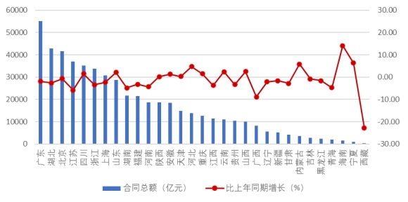 2025 年上半年,廣東、湖北、北京、江蘇、四川、浙江、上海7個地區建筑業企業簽訂合同總額均超過30000億元,分別達到55186.12億元、42908.67億元、41635.43億元、37053.93億元、35232.36億元、33690.69億元和30820.35億元。合同總額超過 20000 億元的還有山東、湖南、福建3個地區。12個地區合同總額出現增長,同比增長最快的是海南,達到了14.06%。19個地區合同總額出現負增長,其中西藏的負增長達到22.74%(圖6)。