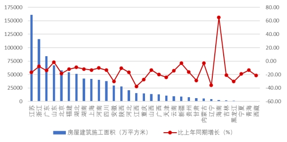 2025 年上半年,江蘇、浙江建筑業企業房屋建筑施工面積均超過10億平方米,分別為16.09億平方米、11.57億平方米。房屋建筑施工面積超過 5億平方米的還有廣東、山東、北京、福建、湖北等5個地區。海南房屋建筑施工面積同比增長了65.01%,其余30個地區房屋建筑施工面積均為負增長,其中江西、遼寧、黑龍江、安徽的負增長均超過30%,甘肅、重慶、天津、西藏、吉林、廣西的負增長均超過20%(圖8)。
