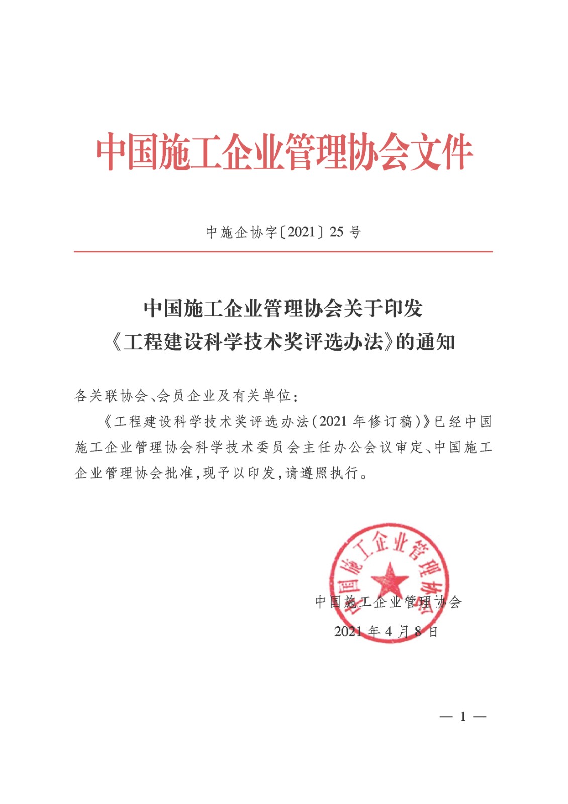 中國(guó)施工企業(yè)管理協(xié)會(huì)關(guān)于印發(fā)《工程建設(shè)科學(xué)技術(shù)獎(jiǎng)評(píng)選辦法》的通知