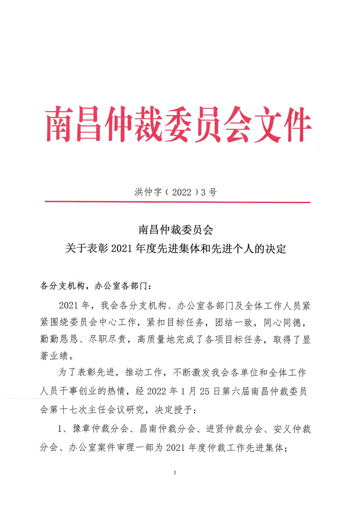 南昌仲裁委員會關(guān)于表彰 2021 年度先進集體和先進個人的決定