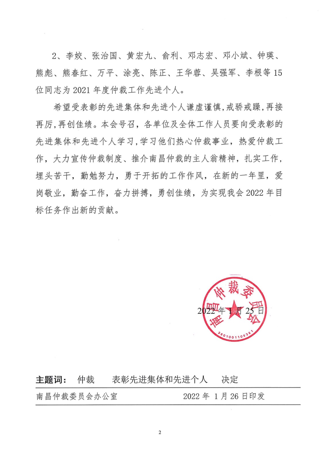 南昌仲裁委員會(huì)關(guān)于表彰2021年度先進(jìn)集體和先進(jìn)個(gè)人的決定